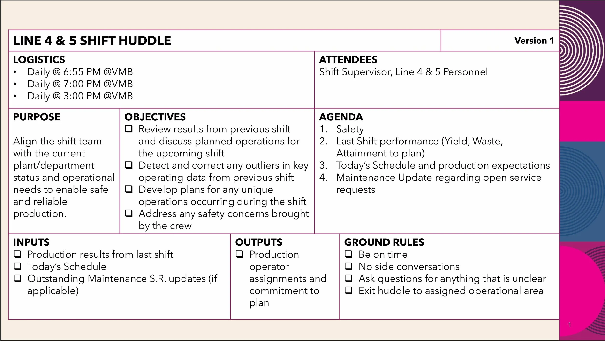 Brought in as an outside consultant, I designed a new Shift Kickoff Huddle process centered around safety and productivity alignment: