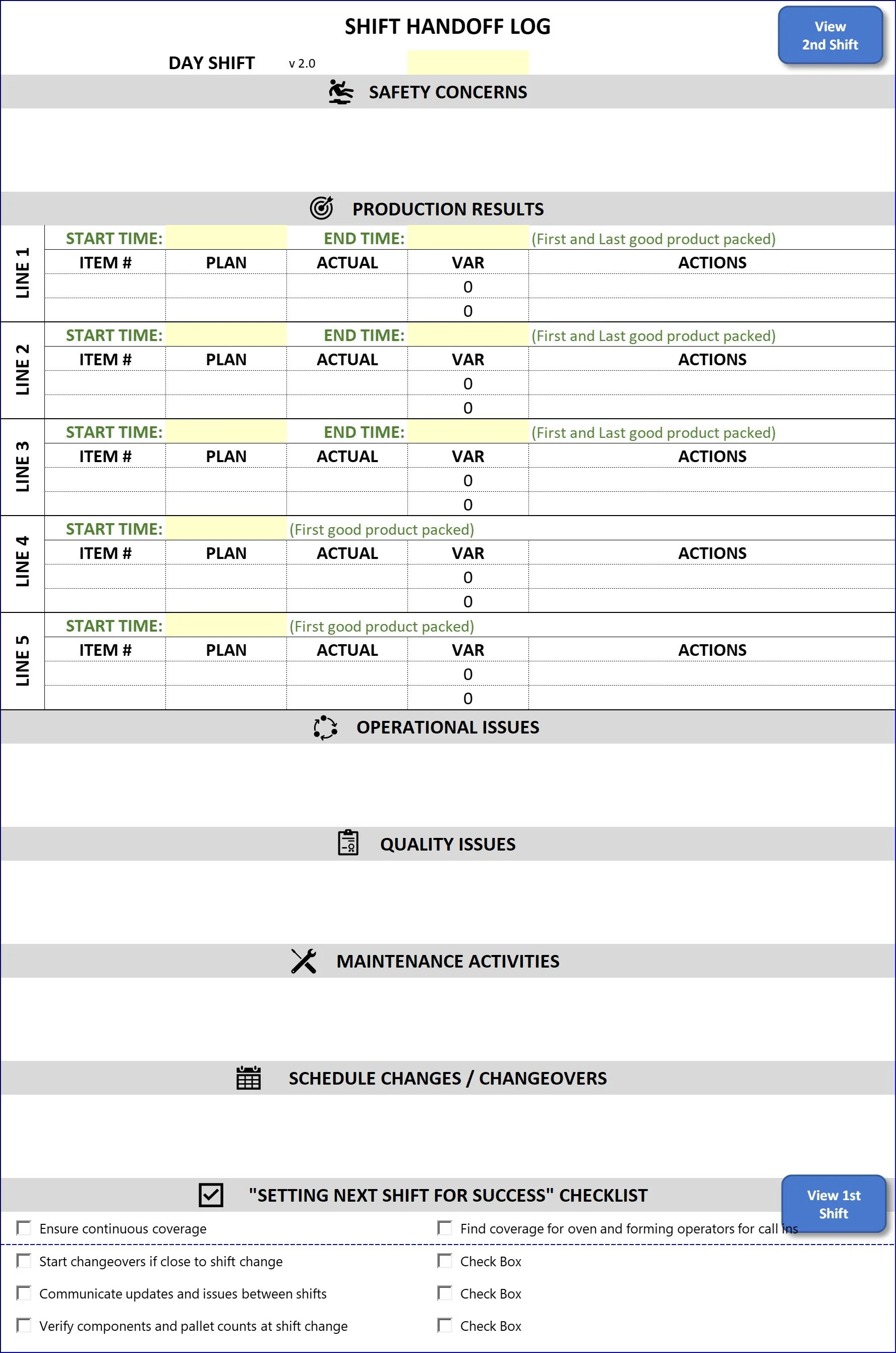 Shift Handoff Log – A real-time record of each production line’s status, including: